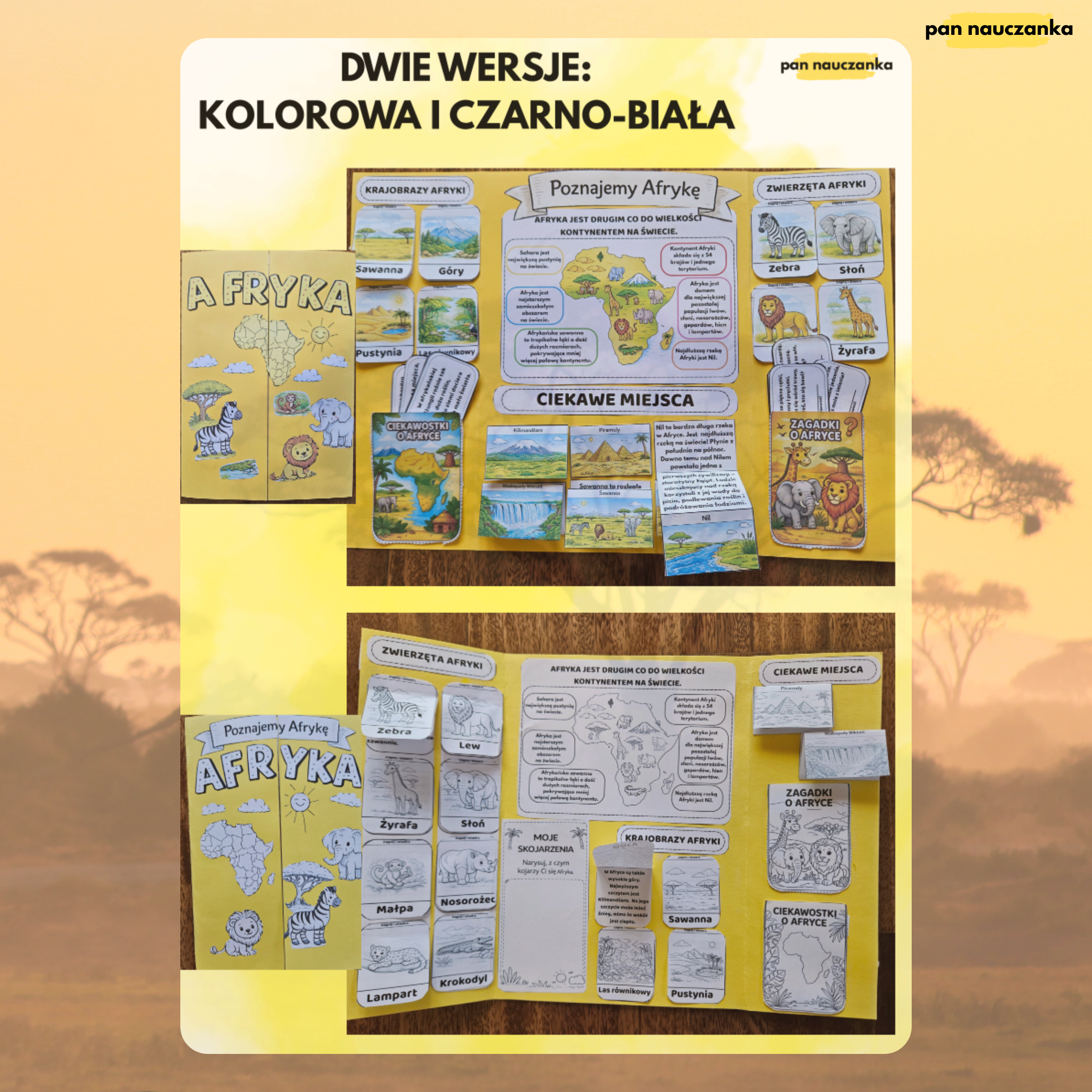 Angażujący zestaw edukacyjny w formie lapbooka, który wprowadza uczniów w tematykę kontynentu afrykańskiego w sposób aktywny i atrakcyjny. Materiał łączy naukę z działaniem – uczniowie wycinają, składają, dopasowują elementy i tworzą własną pracę, dzięki czemu lepiej zapamiętują nowe informacje.