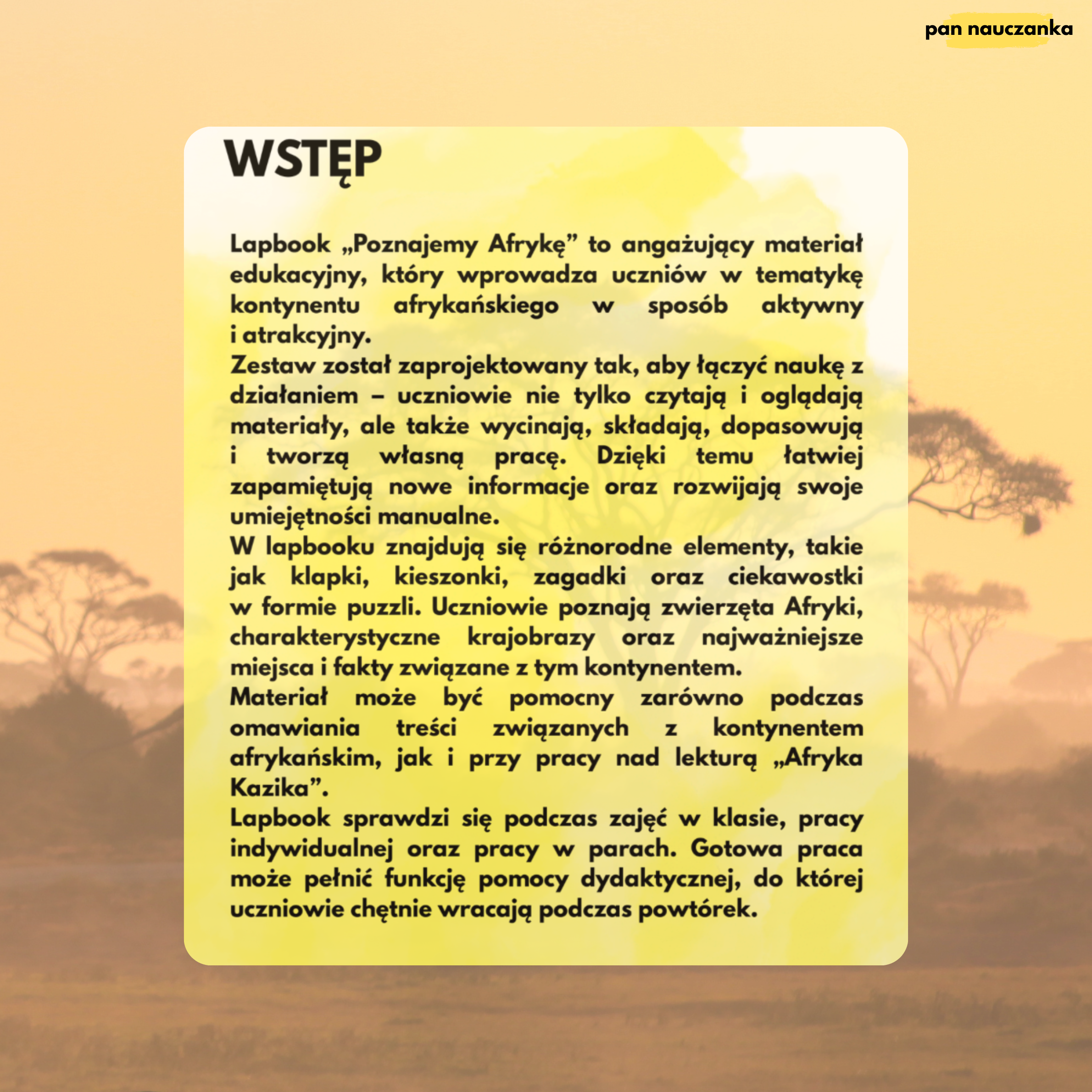 W zestawie znajdują się różnorodne elementy, takie jak klapki, kieszonki, zagadki oraz ciekawostki. Uczniowie poznają zwierzęta Afryki, charakterystyczne krajobrazy, ciekawe miejsca oraz podstawowe informacje o kontynencie.