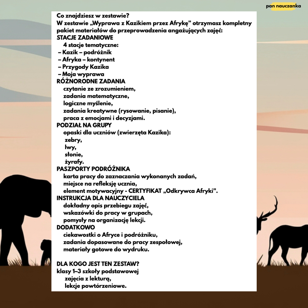 „Wyprawa z Kazikiem przez Afrykę” to rozbudowany zestaw materiałów edukacyjnych, który zamienia zwykłą lekcję w angażującą grę dydaktyczną. Uczniowie wyruszają w pełną przygód podróż inspirowaną historią Kazimierza Nowaka, pracując w grupach i rozwiązując zadania na kolejnych stacjach.